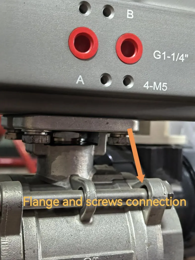 The actuator should be aligned with the valve stem and secured with matching bolts to ensure a secure connection.